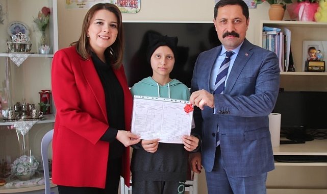 Amasya'da hastalığı nedeniyle eğitimine evinde devam eden 8. sınıf öğrencisi Hicran Erdoğdu, başarılı notlarla dolu karnesi ve takdir belgesini Amasya Valisi Mustafa Masatlı'nın elinden aldı.
